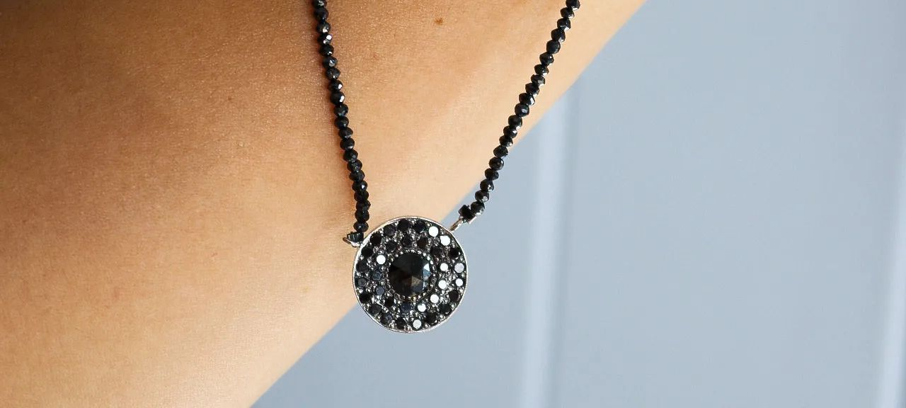 13.65ct of black diamond beaded chain, hand strung to hold an 18ct white gold pendant. Set with a rose cut centre black diamond weighing in at 2.37ct, accompanied by a further 1.1ct or black round brilliant cut diamonds. The total diamond weight is a whopping 17.12ct.