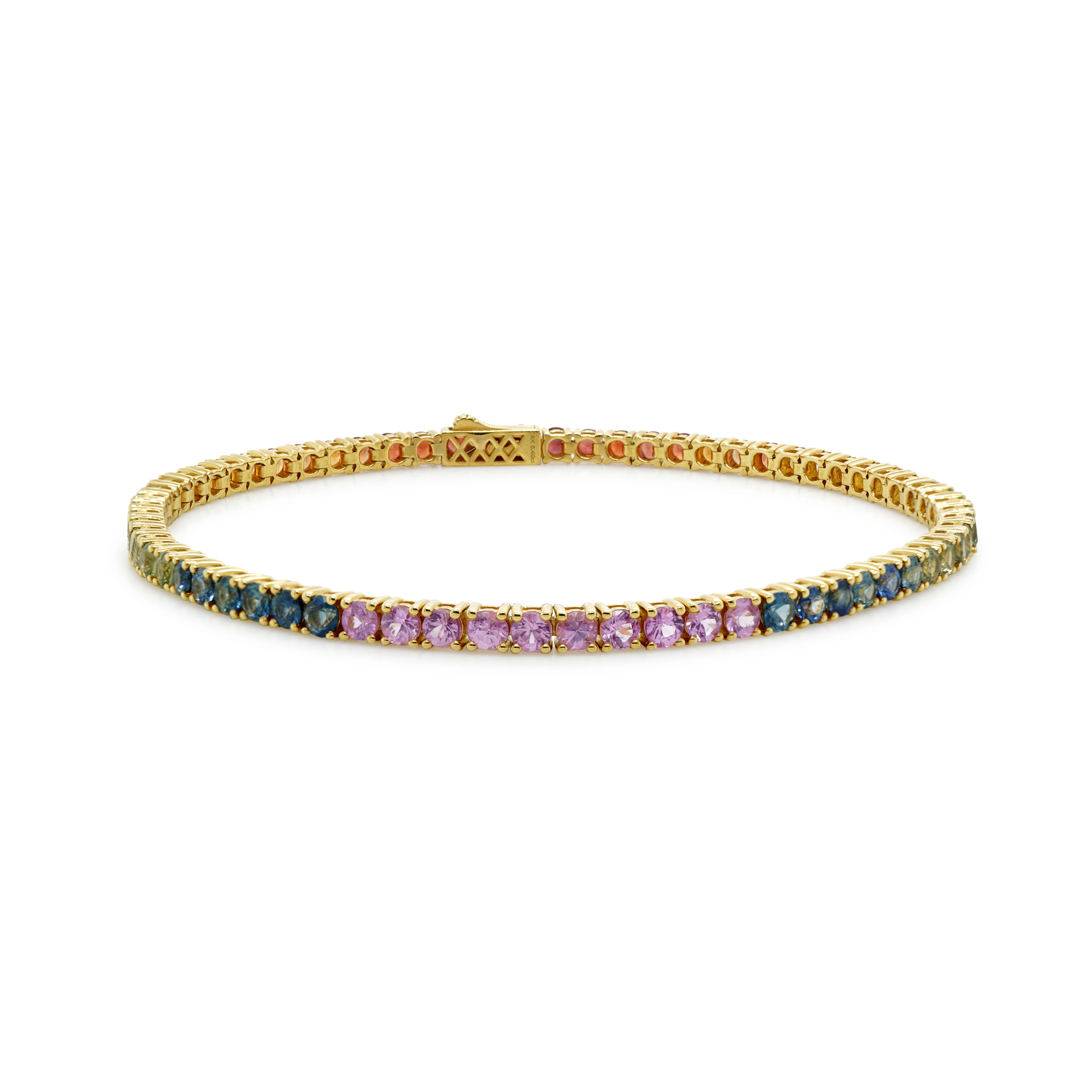 A celebration of color and craftsmanship, this 18-carat rainbow sapphire tennis bracelet is designed to captivate from every angle. A seamless line of vibrant sapphires—each meticulously selected for its brilliance and hue—creates a stunning spectrum that flows gracefully around the wrist. Every stone is perfectly matched to achieve a harmonious rainbow effect.