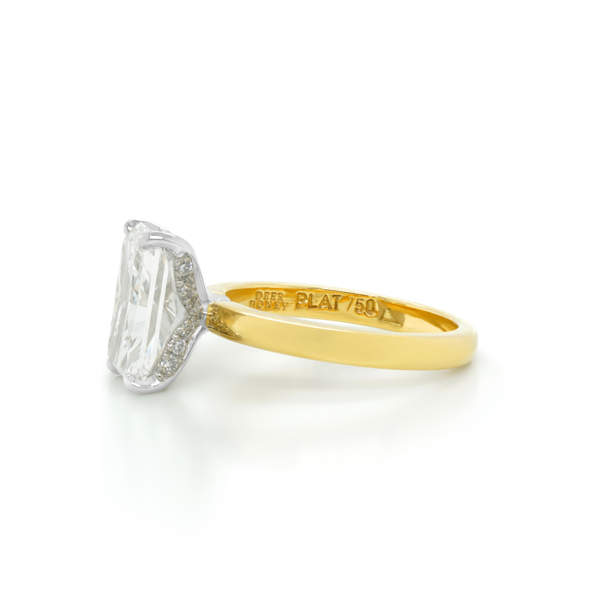A stunning 3.24 carat diamond in a Radiant cut is set in an elegant 18K yellow gold band. Platinum claws beautifully showcase and secure the centre stone, allowing its brilliance to take centre stage. Diamonds adorn the basket for an extra touch of elegance.